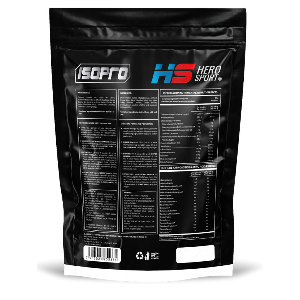 Proteína aislada de suero ISO PRO con 25 g por porción, sabor vaunilla. Sin azúcar, sin lactosa, gluten free, low carb. Alta solubilidad, contiene 18 aminoácidos esenciales. Presentación Bottle Free.